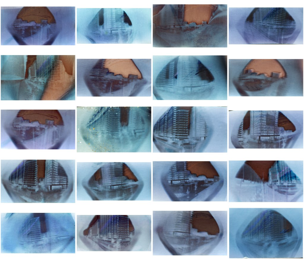 vent et des mouvements divers captés par le papier photosensible à l’intérieur de l’installation. Le cuivre fait référence à notre connexion à travers la matière tant au sein de nos bâtiments, qui nous relient, ainsi qu’avec le territoire d’où ils proviennent.